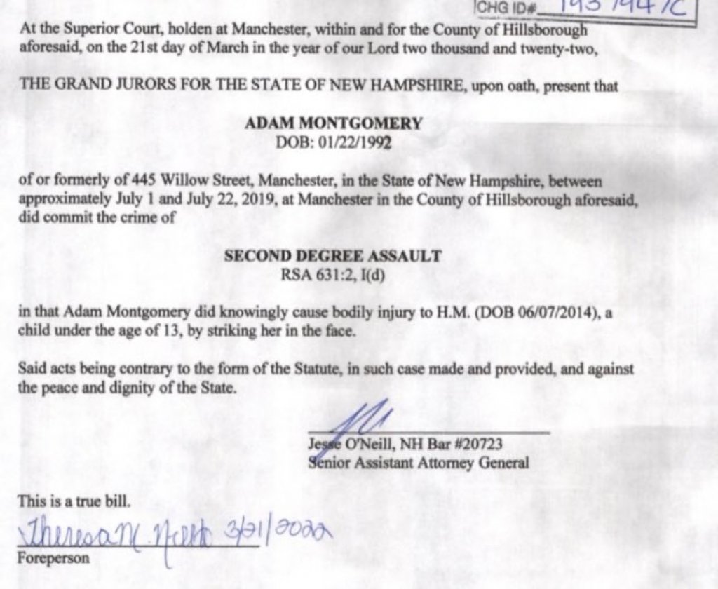 Adam Montgomery’s estranged wife, Kayla Montgomery was also indicted on the charge of Theft by Deception. The indictment alleges that on various occasions between 2019 and 2021 Kayla “represented to NH DHHS that H.M. was a member of the defendant’s household, despite H.M. not being a member of the defendant’s household during that time,” and received more than $1,500 as a result.