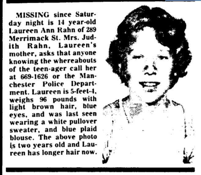 So, the Union Leader has put up a digitized archive of their older articles. Since people have been wondering why there's so few photos of Laureen, here's a brief article from May 1, 1980 with another photo of her I haven't seen anywhere online. Of course, as they note, this photo was taken when she was 12 (the police apparently didn't acquire the yearbook photo until later) and so she looked pretty different by the time of her disappearance. I'll see if I can share more of the older articles later.