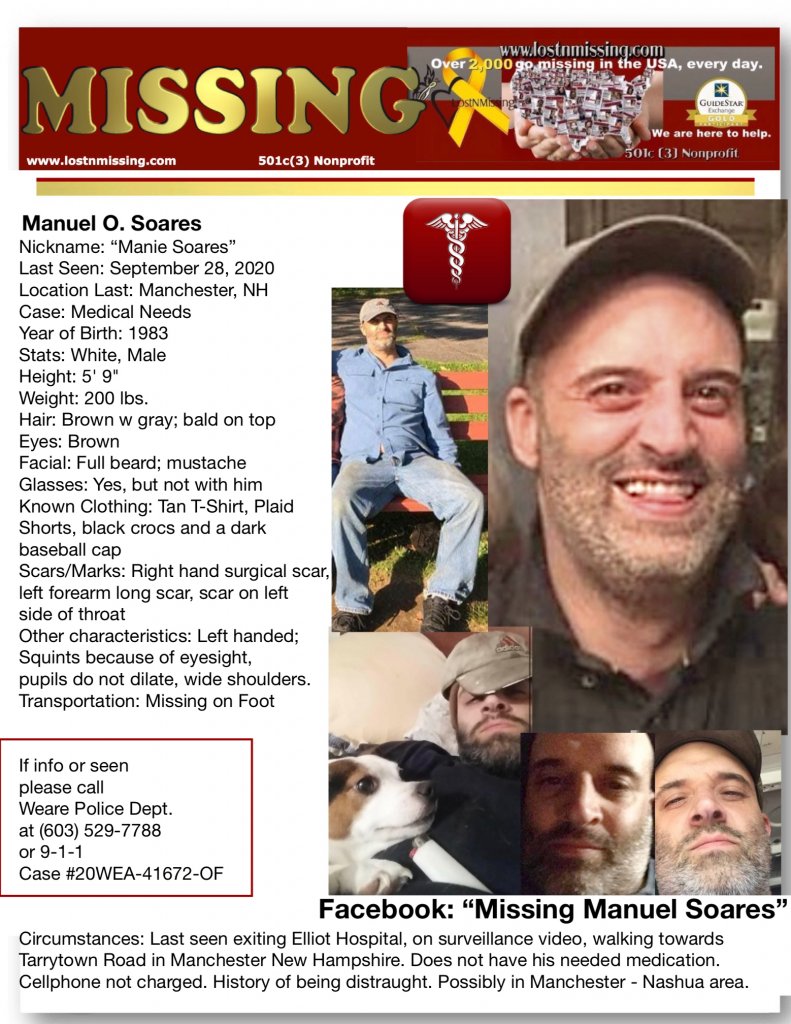 There has not been a confirmed sighting of Manuel Soares, 37, since about 9:40 p.m. on Sept. 28 near Elliot Hospital in Manchester.