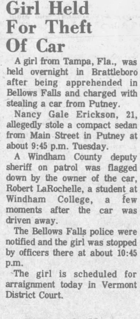 It says in this old news article from the Reformer that she was picked up by the Bellows Falls police, so until I went back and reread, I had processed as she stole the car in BF. If you're familiar with the area too, don't you think it is pretty weird she just found a parked car and stole it in Putney? I'm curious where it was...Like knowing sort of narrows down her movements a lot since it is so small.Where do you get Bellow Falls from?