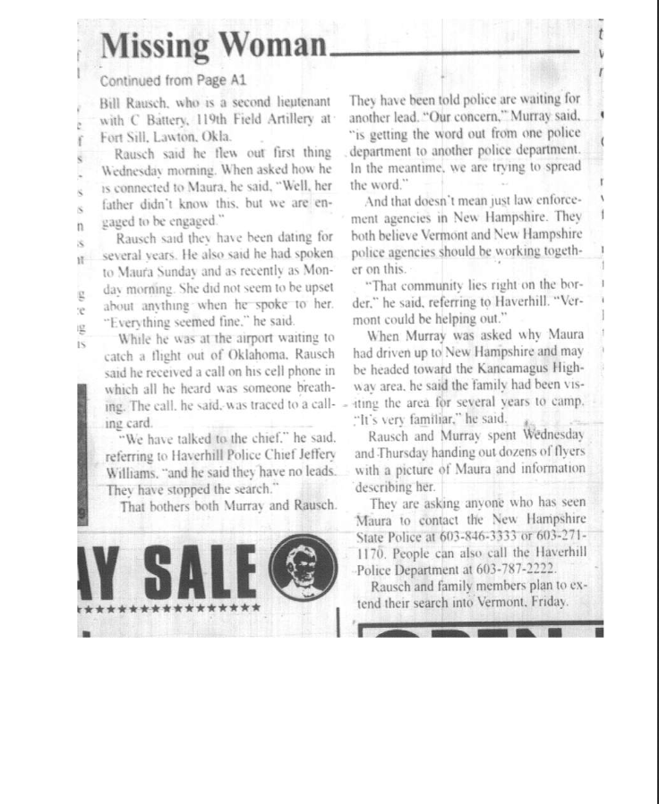 Where this occurred, it's not at all surprising that if she walked away from the crash site heading east and left the road for some reason that her body hasn't been found if she died from exposure. That area is very, very remote, with acres upon acres of nothing but woods, much of it with heavy underbrush. In the dark, it would be very easy to get lost even a short distance from the road. There are plenty of reasons why a person would leave the road--to hide from passing traffic if you didn't want to be seen, to relieve yourself, to follow what you thought was a trail...if Maura had been drinking, any of those is a possibility.