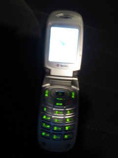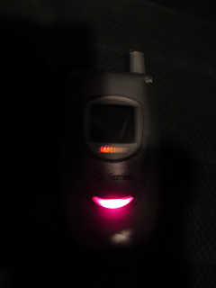 These are some pictures of the Sprint Samsung SPH-A620 (Maura's phone) I bought a while back. Sorry they came out a bit blurry, but they should illustrate the red light on the front of the phone when closed. I also included a picture of the phone open to show the color of the keys. Note that now that I have fully charged the phone, that light isn't always red. Sometimes it is off, sometimes it blinks, and sometimes it is the same green color as the keys. I don't have Sprint, so I can't make calls with the phone or observe it in normal use. This means that I don't actually know how likely it would have been that it would have shown red the night Maura went missing, but I think it's a definite possibility.