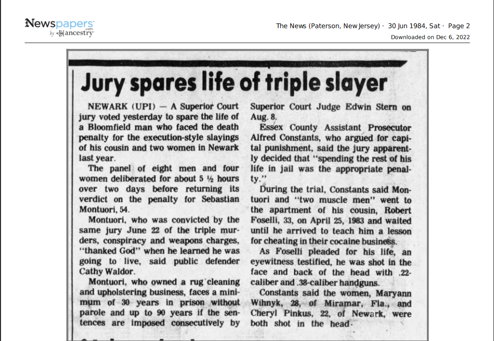 Sebastian Montuori was convicted in June 22 1984 (see article) of triple execution style murders and so he's most likely the prime suspect in Nancy's murder case to.