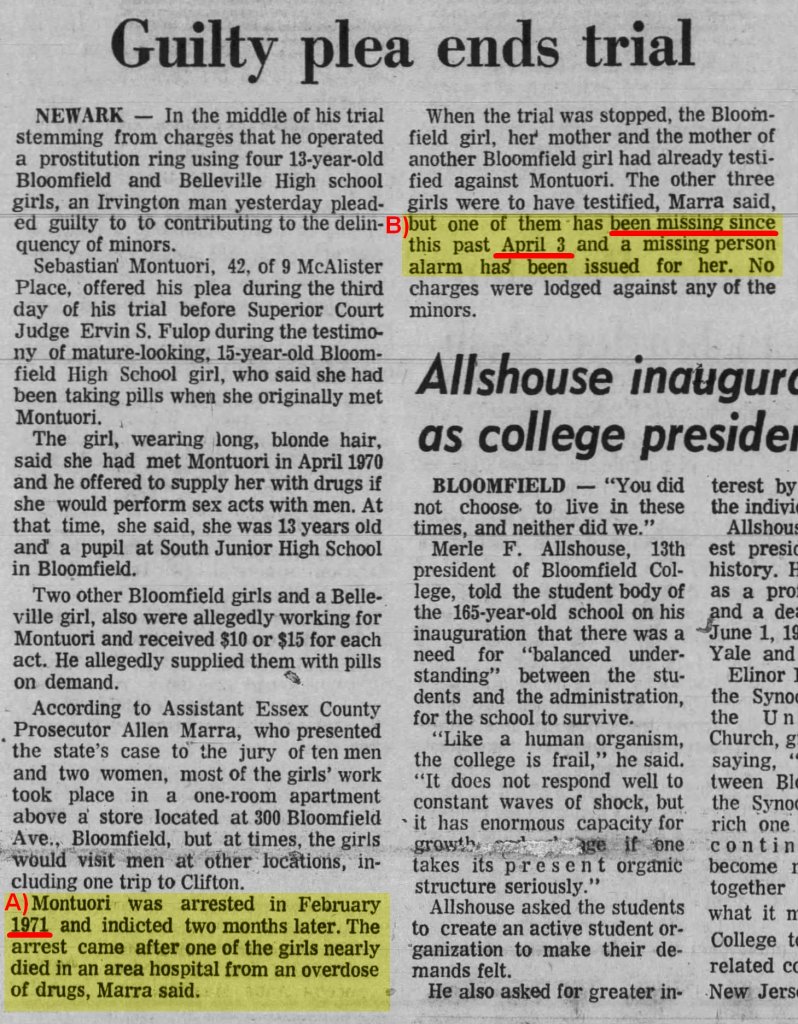 It's very likely that Nancy was the girl in that newpaper article that overdosed, which then alerted the police. This then led police to investigate this illegal sex/drug ring that got Sebastian Montuori arrested.
