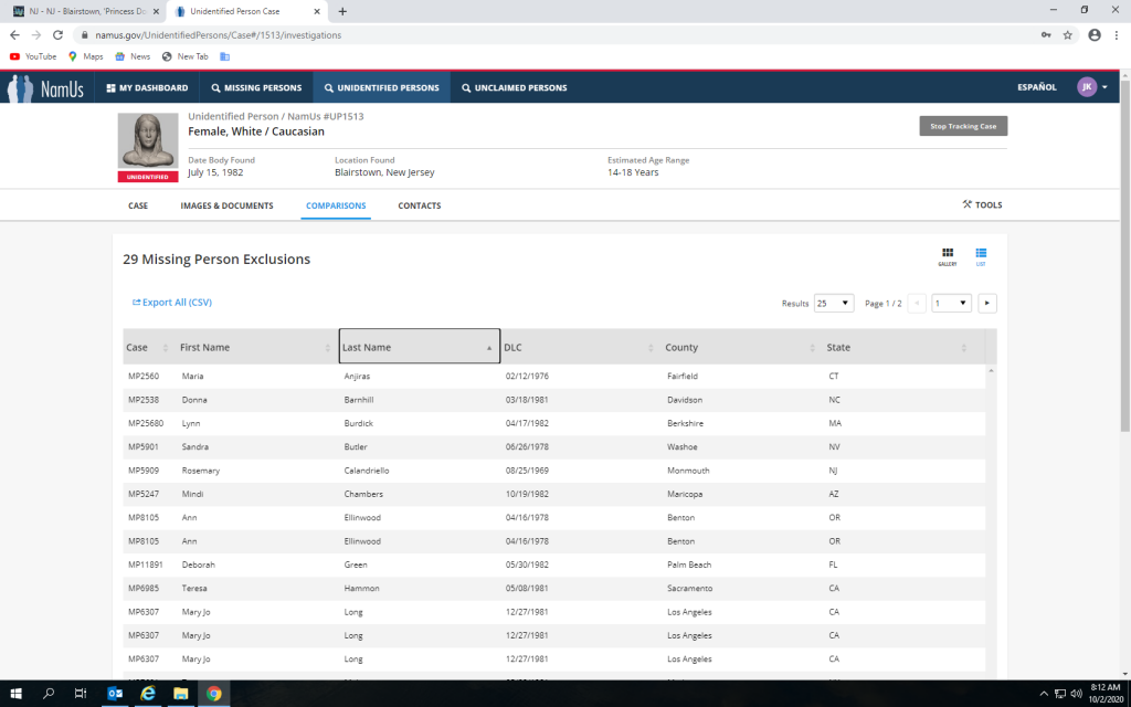 I read somewhere on WS that this was the case. I don’t remember where I saw it and have no clue if it’s accurate or not though.How is it that some names (such as Mary-Jo Lee Long) show up multiple times ? Were they ruled out through different methods, i.e DNA then dentals or fingerprints ?