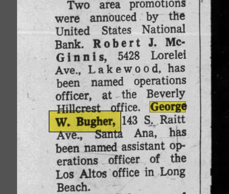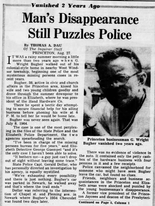 George Wright Bugher was last scene at approx. 1900 hours on 7/8/1964 at Hand Hardware Store by some business associates. Mr. Bugher was an owner of Hand Hardware Store which was in financial trouble at the time of his disappearance. Also missing was a cash box with over $600.00 and Mr. Bugher's vehicle. Left behind at the Hardware Store was Mr. Bugher's wallet. Mr. George Bugher's vehicle and an empty cash box was found several days later in the neighboring city of Newark, NJ.