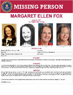 Margaret Ellen Fox was last seen on June 24, 1974, after travelling by bus to meet with a man who called himself "John Marshall" and had advertised for a babysitting job. Margaret was planning to go by bus to Mill and Main Streets in Mount Holly, New Jersey, to have an interview with this man about babysitting his young son. The man's phone number was later traced to a pay phone in a local supermarket. Margaret was seen getting on the bus in Burlington, New Jersey, at approximately 8:40 a.m. en route to Mt. Holly, but she has never been heard from again.