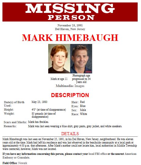 There is a man in prison in PA that was the primary suspect in Marks disappearance, supposedly a male prostitute who frequented him stated the individual in question, once showed him a video that contained Himebaugh , he confirmed it was him and that he abducted him, then reportedly told the Male prostitute, he had abducted and "disposed of" other young boys as well
