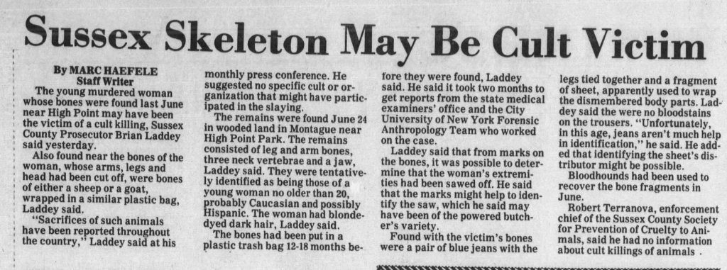 Definitely agreed could be Cottingham because the time frame seems to line up. I would think perhaps Rifkin, although his first known victim is '89, right? (But that's first known.) But these possibilities with Rifkin & Cottingham don't really explain the animal bones in plastic. That sounds like something where animal sacrifice was practiced. There are religions in New Jersey/NYC area where there's wide variation in practice, and some practitioners do engage in animal sacrifices, there are news stories and litigation related to it.