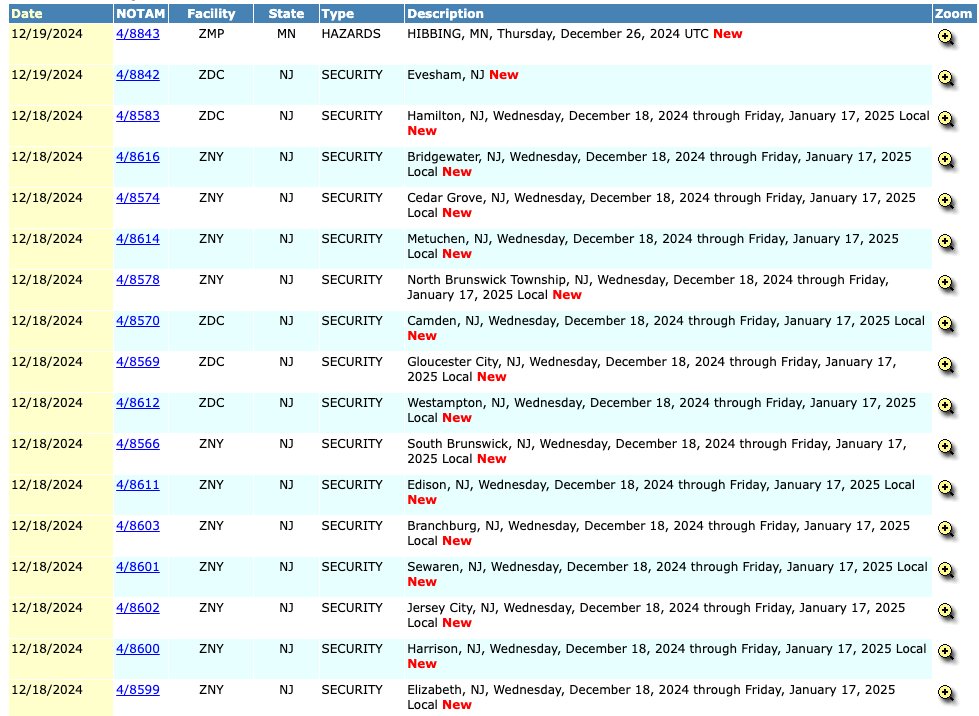 The temporary flight restrictions, which are set to last until Jan. 17, have been implemented beginning Wednesday in the following locations: Hamilton, Bridgewater, Cedar Grove, North Brunswick, Metuchen, Evesham, Camden, Gloucester City, Westampton, South Brunswick, Edison, Branchburg, Sewaren, Jersey City, Harrison, Elizabeth, Bayonne, Winslow, Burlington, Clifton, Hancocks Bridge and Kearny.