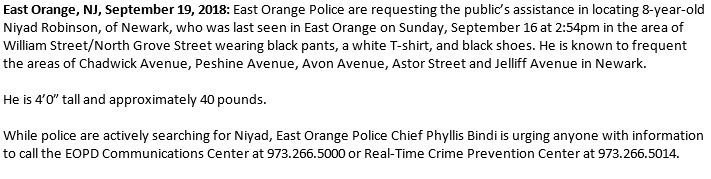 East Orange Police are requesting the public’s assistance in locating 8-year-old Niyad Robinson, of Newark, who was last seen in East Orange on Sunday, September 16 at 2:54pm in the area of William Street/North Grove Street wearing black pants, a white T-shirt, and black shoes. He is known to frequent the areas of Chadwick Avenue, Peshine Avenue, Avon Avenue, Astor Street and Jelliff Avenue in Newark.