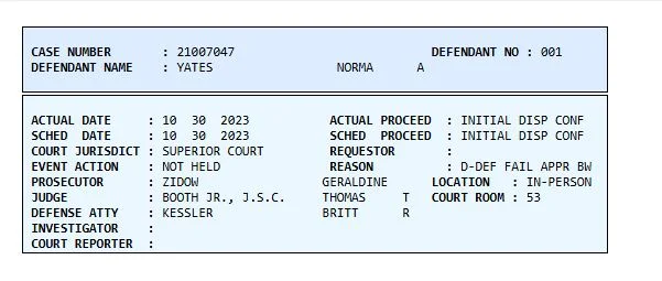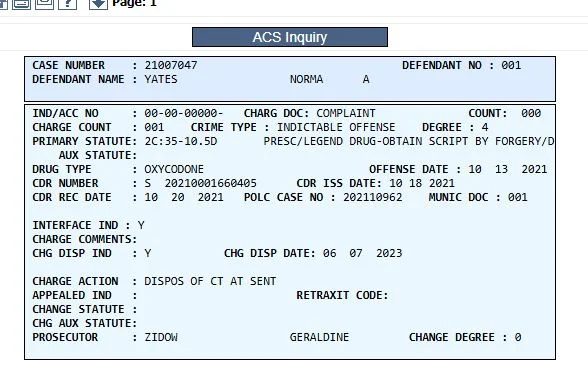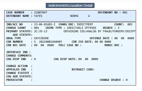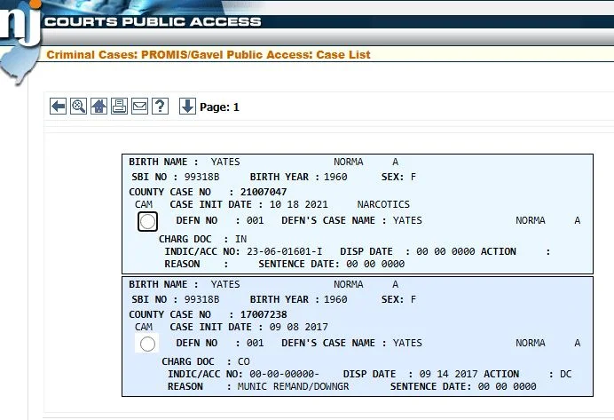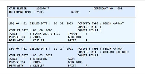 Norma A. Yates born in 1960, right height and weight, has a bench warrant out on narcotics charges (issued Oct., 2023). New Jersey Case # 21007047 obtaining controlled substance by fruid, deceipt, forgery (oxycodone). An earlier case in 2017 (Case No. 17007238) involved a false report to LE. That one is closed.