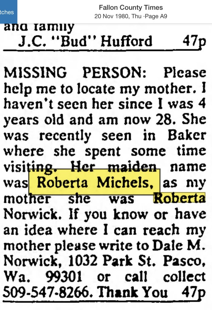 For the initial 19 years of my life, my knowledge of my paternal line was limited, as my father, K.J., had been placed in foster care at the age of (about) eight, leaving us with scant information about his family, particularly his mother, Roberta Michels, my grandmother. Over those years, various speculations circulated among my grandmother and others who claimed to have seen her: