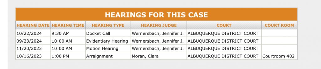 10/2/23 Update: Grand Jury indictment. Order Presentation Order send notice to attorney & defendant to appear for arraignment & conditions/Bond to be considered at arraignment. Notice: Victims Crime Act. 10/3/23 Update; Order denying State's expedited Motion for pretrial detention. 10/6/23: Request for Discovery; demand for exculpatory information; demand for speedy trial. Arraignment hearing on 10/16/23. 10/13/23: Demand for Notice of intention to claim alibi and/or entrapment. DA enters-L. Roybal. Certificate of Readiness. Notice of redaction of personal ID info pursuant to 5-502.1 NMRA. State's first witness list. 10/16/23 Update: Arraignment hearing before Judge Moran. Setting conditions of release-pretrial services. Plead not guilty. Judge excusal/peremptory challenge. 10/17/23 Update: Hearing (scheduling conference) on 11/9/23 @ 11:15am. Notice of Judge reassignment; Honorable Judge Wernersbach.