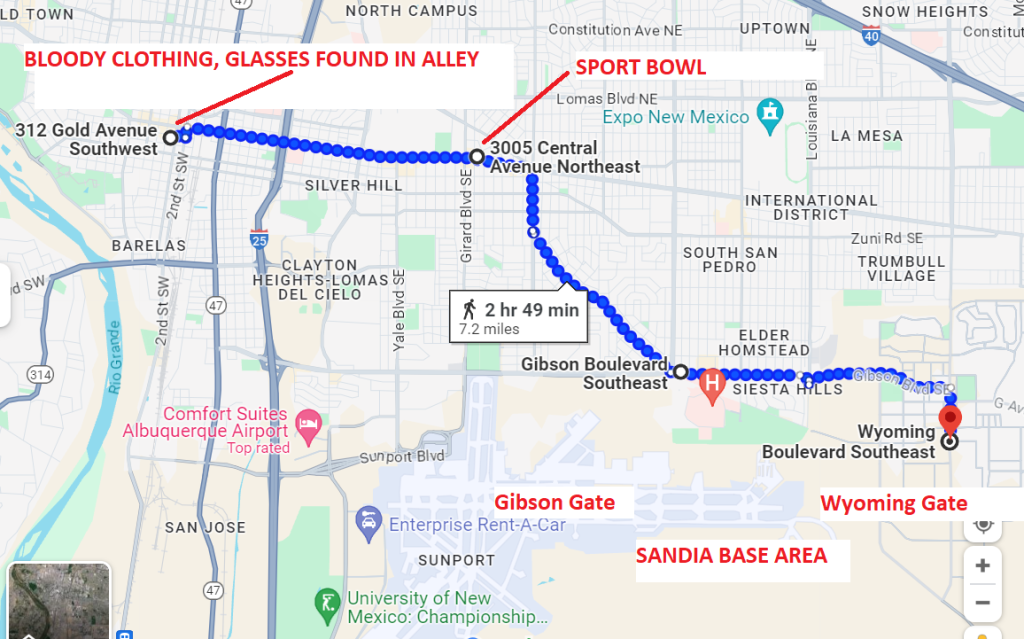 If Whitacre left the bowling alley that night to head back to the base (no one saw him leave), he was going in the wrong direction if we are to believe he ended up in that alley. I, too, believe those items were staged in the alley. Or tossed. I'm guessing they were thrown out of a vehicle. It's a 44 minute, 2 mile walk from Gold Ave to the bowling alley, or eight minutes in a vehicle.