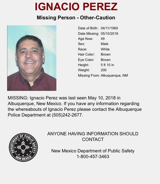 The New Mexico Department of Public Safety listed Perez Jr. as a missing person May 10, describing him as a 5 feet, 10 inches tall and about 200 pounds, with brown hair and brown eyes. His last known location was not included in the report.