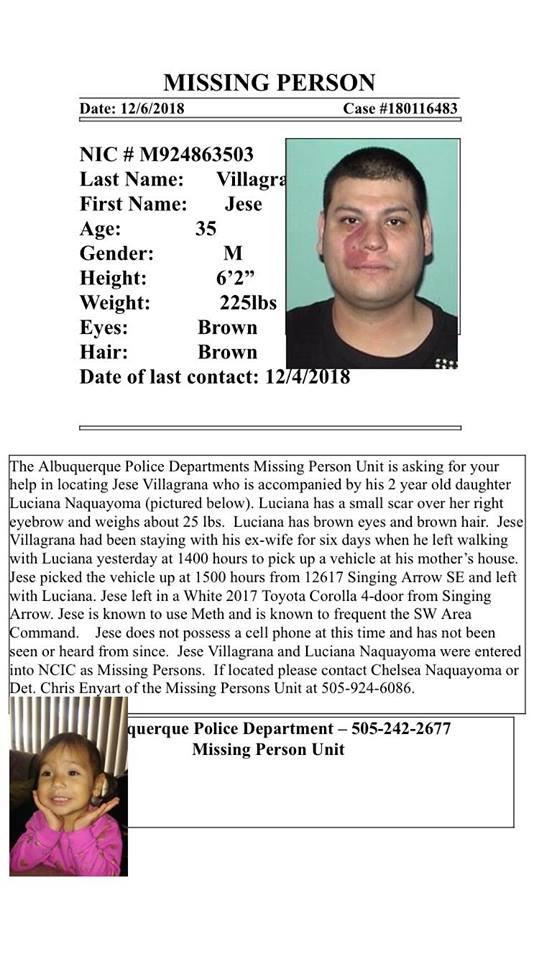 Albuquerque police spokesman Simon Drobik said Jese Villagrana, 35, and Luciana Naquayoma, 2, was last seen leaving Villagrana’s mother’s house around 3 p.m. on Tuesday.