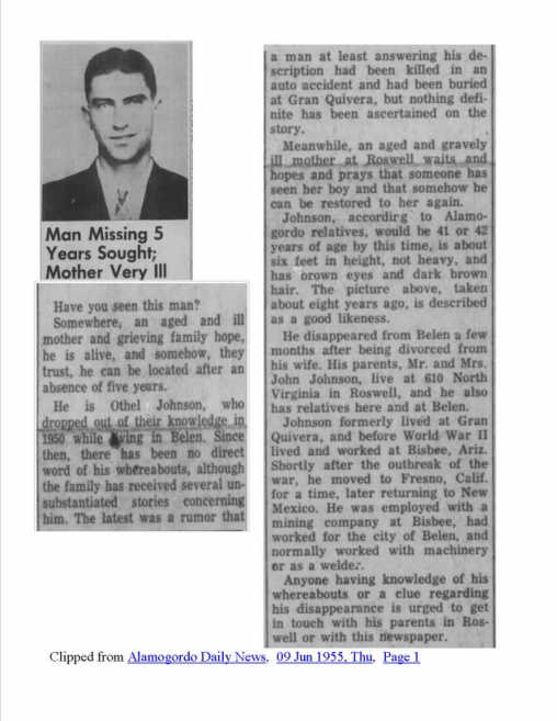 An obit for John Johnson, Othel’s father shows that he was father of Othel (Billy) Johnson. It further states that his parents and wife preceded him in death with no mention of his son, Othel, as being deceased.