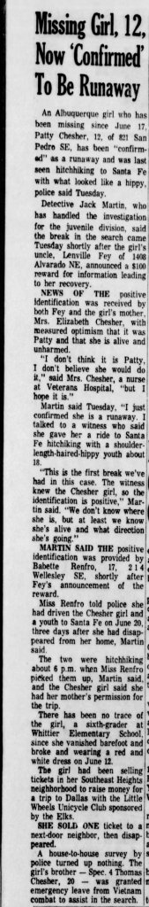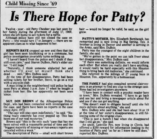 "Patricia disappeared from Albuquerque, New Mexico at 3:00 p.m. on June 17, 1969. She left her home in the 800 block of San Pedro Drive southeast to sell raffle tickets for the Elks Club. Patricia returned home briefly to pick up her coin purse which she'd forgotten, then left again, and never returned. She was last seen by a neighborhood girl who waved to her on the street.