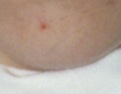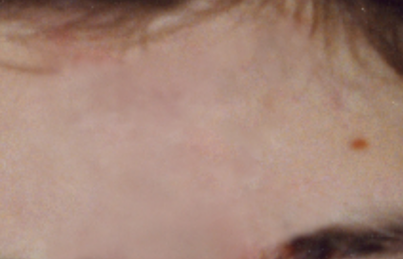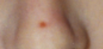 Red by hairline, and red dot on her forehead
