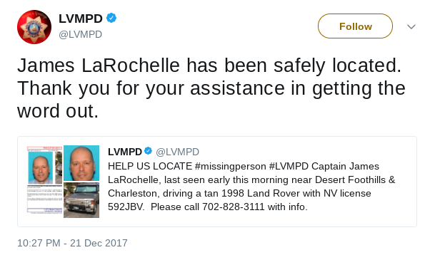 Metro Police Capt. James Larochelle was last seen Thursday about 2 a.m. in the area of Desert Foothills Drive and West Charleston Boulevard in Las Vegas. He was driving a tan 1998 Land Rover with Nevada license plate 592-JBV.