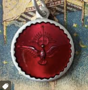 Jewelry: Small religious medallion that had a red plastic cover over a sunburst and dove on a chain with the inscription "Come Holy Spirit, Enlighten Me"