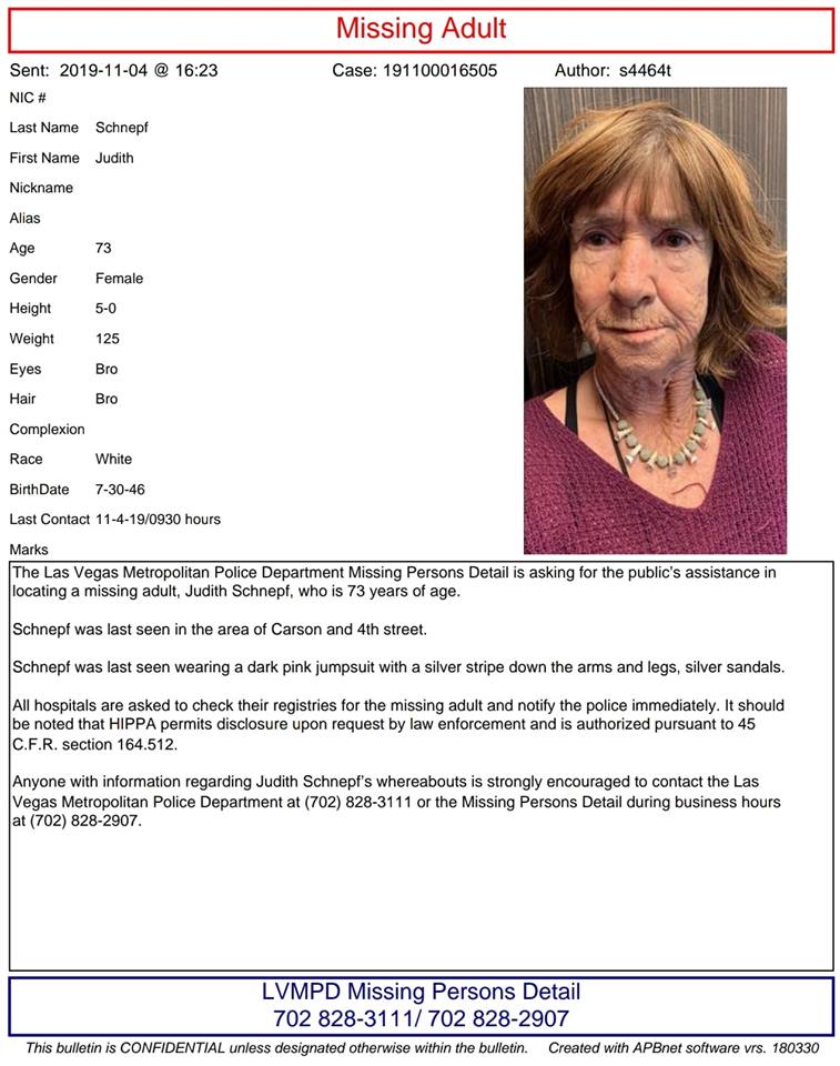 Judith Schnepf was last seen in the area of Carson Avenue and 4th Street on Monday, Nov. 4. Judith was wearing a dark pink jumpsuit with a silver stripe down the arms and legs and silver sandals.
