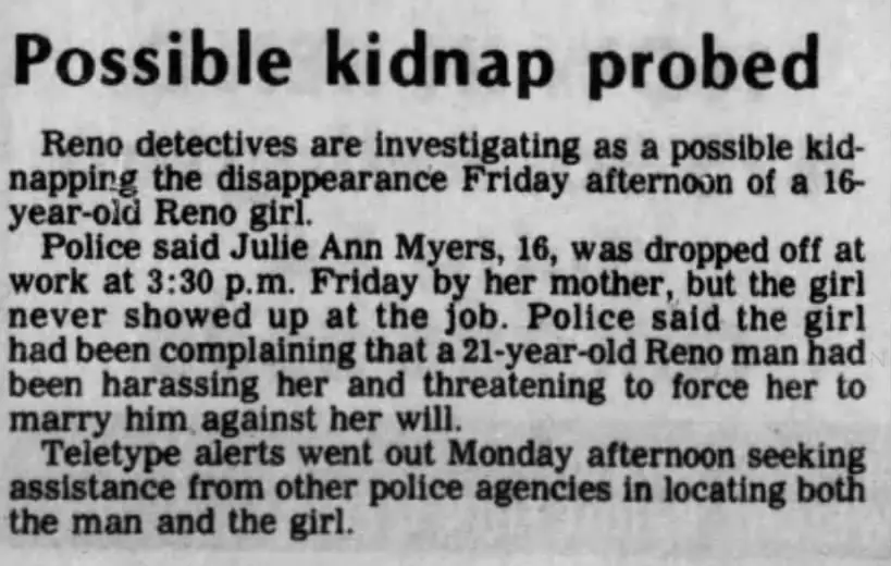 Julie Ann Myers was a student at Wooster High School at the time of her disappearance. She was working as a swing-shift waitress at Sir Loins Steak House at 2450 Virginia St in Reno. She was last seen by her mother, who dropped her off at the Weinstock department store at the Park Lane Centre around 3:30 the day she disappeared. Julie was there to buy a present for a coworker before her shift, but failed to show up for her shift. She had plans to go out with her coworkers after her shift that night, and had a dinner scheduled with her uncle the next day.