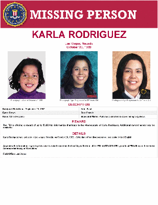 Karla (Karlita) Carolina Rodriguez had just turned 7 years old when she disappeared on October 20, 1999, in Las Vegas, Nevada. Karla was missing from school that day and was last seen in the evening by a friend in her neighborhood. Unfortunately, she has never returned home.