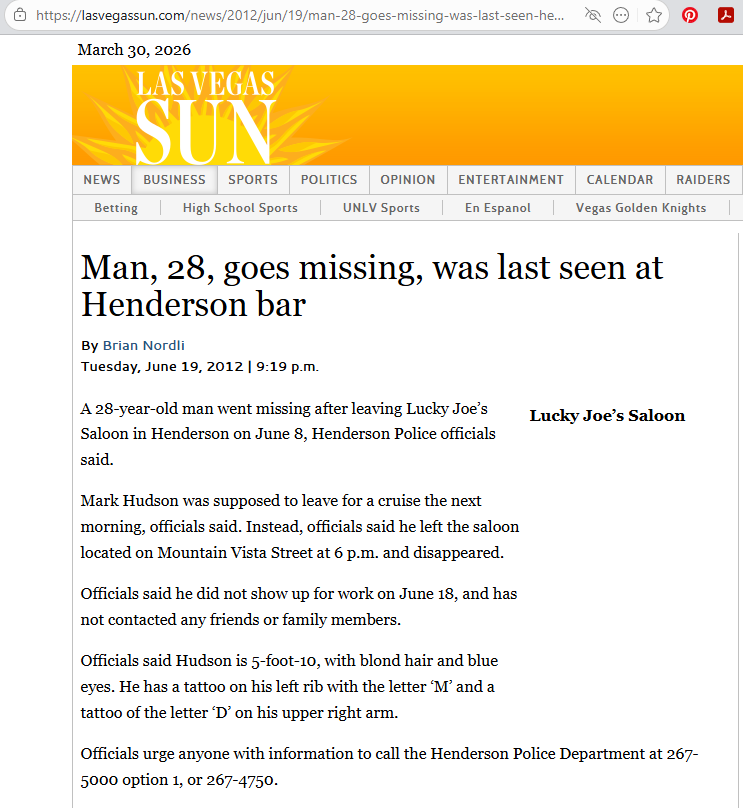Here's the screenshot of my NAMUS search that shows that this Mark Hudson (Nevada, DLC 2012) is *not* listed.