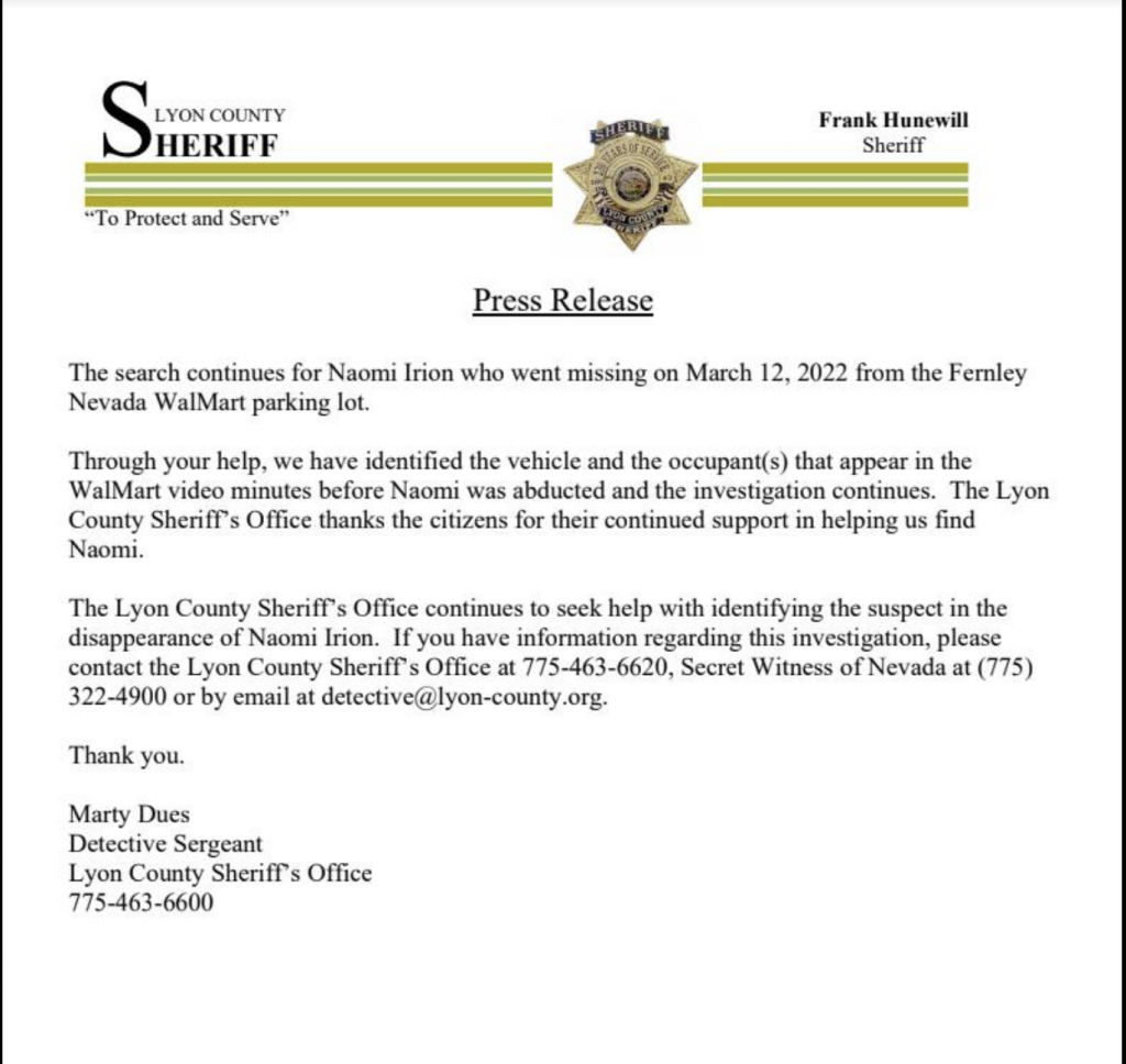 Video surveillance shows a person walking from a nearby homeless camp, lurking in vehicles, the Lyon County Sheriff’s Office said. He is then seen getting into the driver’s seat of Naomi’s vehicle and leaves in an unknown direction with Naomi in the passenger seat.