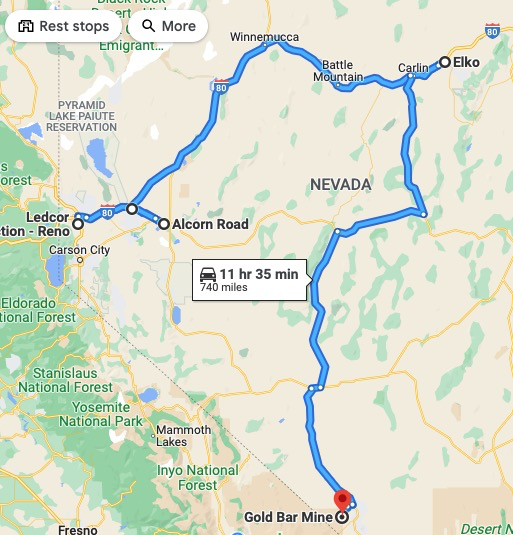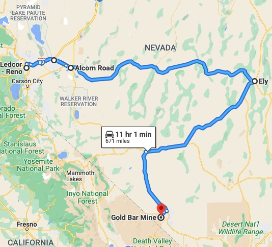 It is about a 3 hour, 200 mile drive from TD's residence EAST on Highway 50, about 25 miles east of the tiny town of Austin and then north on Hot Springs Road to the Gold Bar Mine Road to the site.