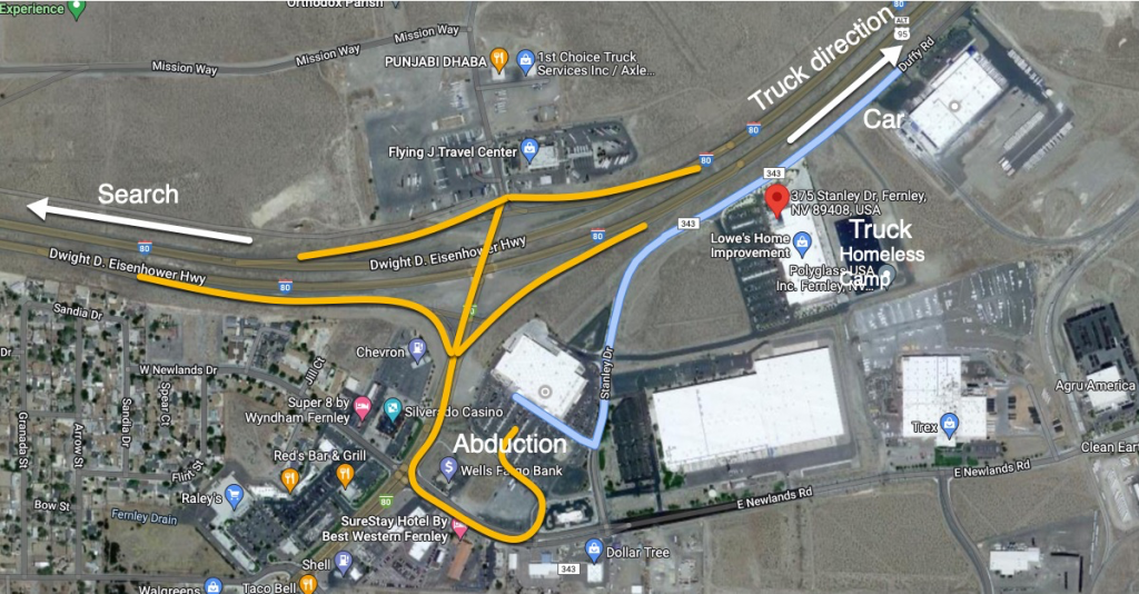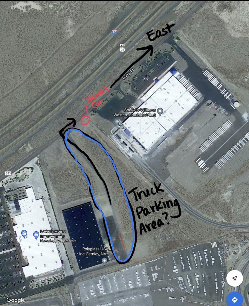 The other thing is that that route is kinda something only locals know about. It’s not a main road in and out of town that everyone uses. I don’t live in Fernley, but I’ve been to that Walmart multiple times and I didn’t even know the road went that far past the Walmart. So it really seems to only be something people know about that are either from the area or know the area fairly well. Truckers are also known to park along that route almost daily (based on what locals have said and also someone went out to that location today and there were trucks parked out there). Since I-80 is a freeway that goes across the country it’s a major trucking route and there’s always truckers stopped along it. At least in this area. There’s even a truck stop almost directly across the freeway from the Walmart. I’m not trying to say I believe it was a trucker. I’m just trying to say that, along with locals, truckers are also people who would be familiar with that side road.