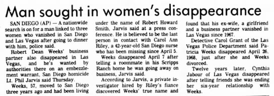 Patricia Weeks went missing from Las Vegas, Nevada approximately two weeks after her divorce from her husband was finalized. Patricia's vehicle was later found abandoned near the Las Vegas airport. Her ex-husband, Robert Weeks, was convicted of her murder in 1987 but would not disclose any further information on the location of Patricia.