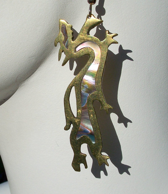 Unusual brass and abalone dragon? earrings Have a similar figure to a dragon but could be anthropomorphic/abstract instead Unsigned for maker or metal but are brass and abalone shell, probably artisan made Possibly Mexican in origin Very dramatic figural earrings, sure to be noticed Vintage Dragon Earrings,Vintage Abalone Earrings, Vintage Brass Earrings,Anthropomorphic,Unusual Earrings,Artisan Earrings,Abstract Earrings CONDITION: Very nice used condition, some patina on the brass, have not been polished SIZE: Measure 3" long including the wires SHIPPING: I am able to combine shipping on multiple items, combined rates are already set up NEED MORE INFO? Just send me a convo and I will get back to you as soon as I can. For more interesting vintage jewelry finds, check out the remainder of my shop OldTreazureTrunk: https://www.etsy.com/shop/OldTreazureTrunk 05f6ffb2a01f4027cdb979a79f8bd31a[1].jpg