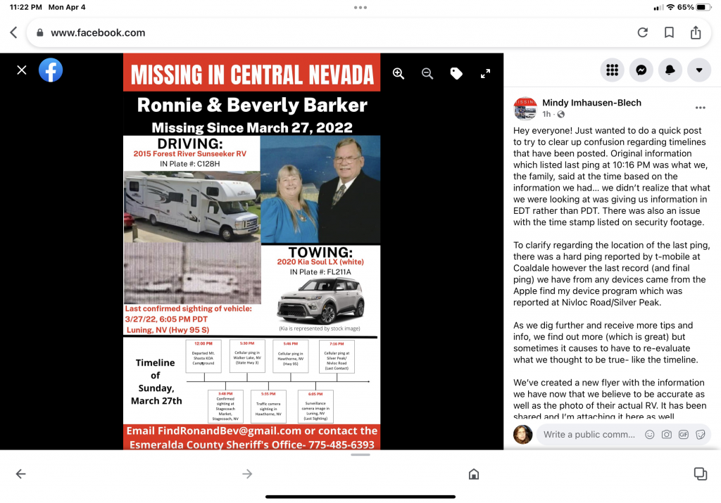 Because "Family and friends who are posting updates on social media write that Ronnie and Beverly Barker left Albany, Oregon on March 26 heading for Fallon, Nevada followed by a stop in Las Vegas before continuing on to Tucson on March 29 where they were expected to meet with friends."