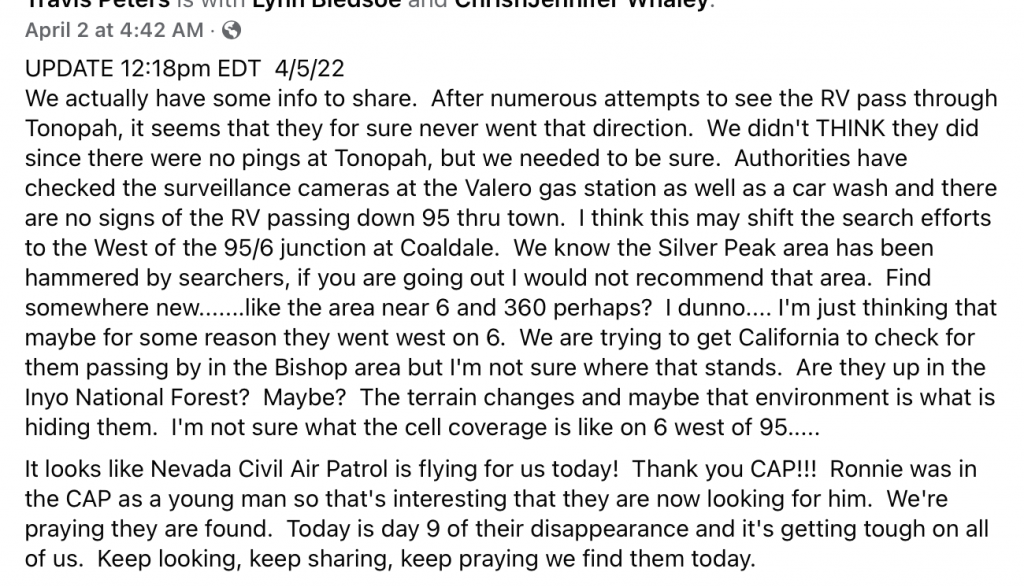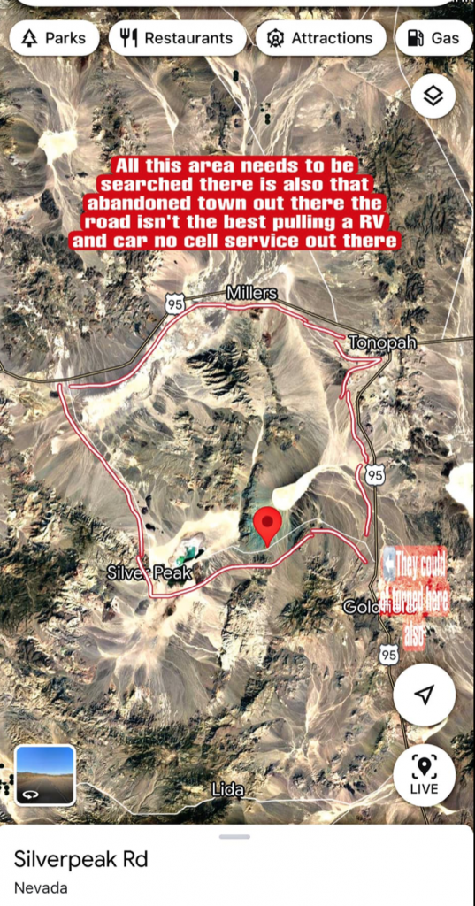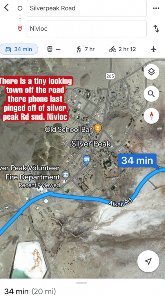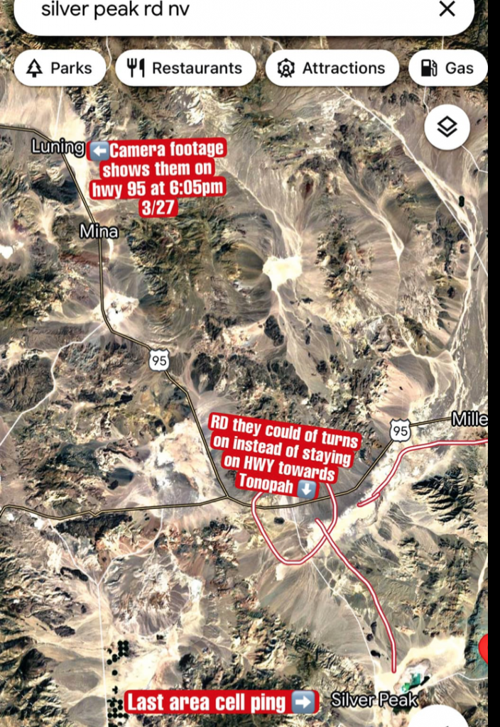 There is also a huge off-limits Nellis Air Target and Target Practice area that is just outside of Tonopah. It's not an Air Base, but there is a chance that was the location they had entered and thought they were driving to. That could have been estimated at an 8 hour drive. That really does alight better with their trip progress, until they disappeared.