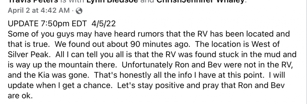 With the KIA gone and them missing, it sounds like someone was trying to dispose of the camper -trailer