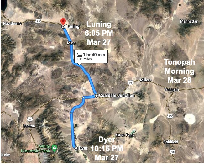 What if they stopped near Luning to eat. What if, at that time, someone entered their RV. What if that person made himself known just past the Coaldale Junction. What if the couple are somewhere around Dyer, and at least one vehicle drove towards Tonopah. That explains the timeline. All hypothetical.