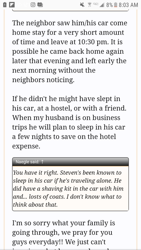 Exactly, but GW has never sit right with me. I mean he was also in the same area that Steven was in which is a little strange to me. If they were “such good friends” why didn’t he ask him what he was doing near Las Vegas anyway? If Steven was my “good friend” I would ask him what he was doing there. Also with the LL I personally don’t believe the drug theory. In his episode on “Disappeared” the police had dogs come and sniff his car for drugs for an hour. They came to the conclusion that “there were no drugs in his car and he never had drugs in his car.”