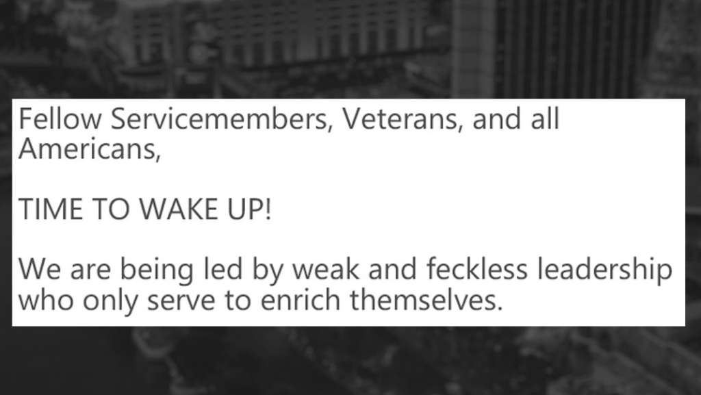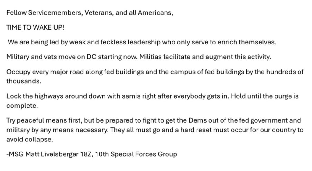 More from Livelsberger, who was an active duty U.S. Army Green Beret: "We are being led by weak and feckless leadership who only serve to enrich themselves."