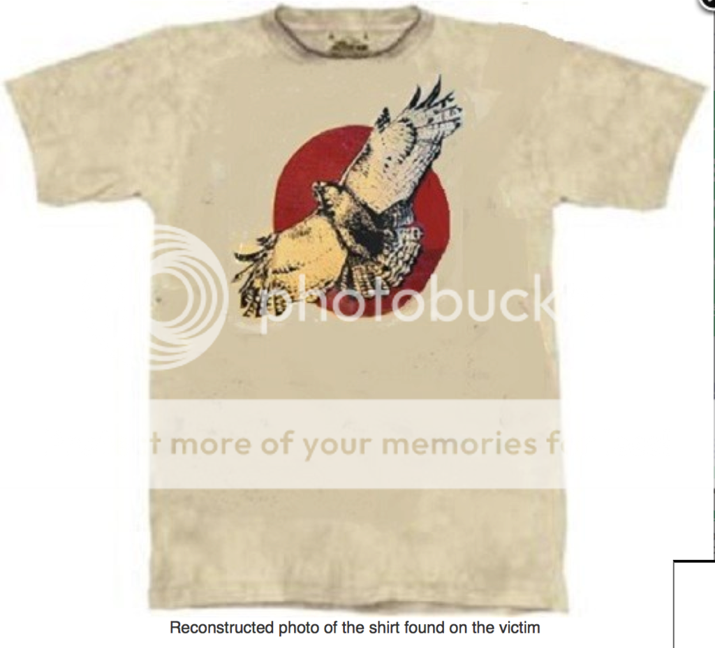 Photo posted on NAMUS of the t-shirt fragment found on the victim (around neck and upper arm):