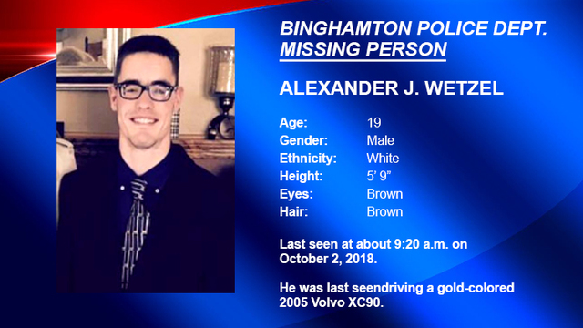 Alexander J. Wetzel was last in contact with his family around 9:20 a.m. Tuesday, Binghamton police said. He was believed to be operating a gold-colored 2005 Volvo XC90.