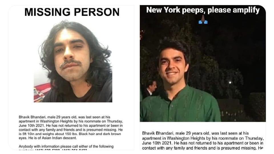 Bhavik Bhandari, was last seen on June 10 at his apartment in Washington Heights in Upper Manhattan. He has neither returned to his apartment nor contacted friends and family since then.