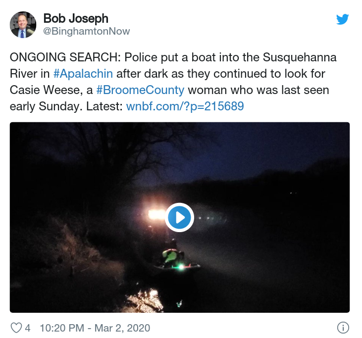 Casie Weese was last seen walking east on Main Street, away from the car and away from the party they had just left, the trooper said. State police do not know exactly where on Main Street the car broke down, but they believe it may have been just east of a bridge near Apalachin Creek.