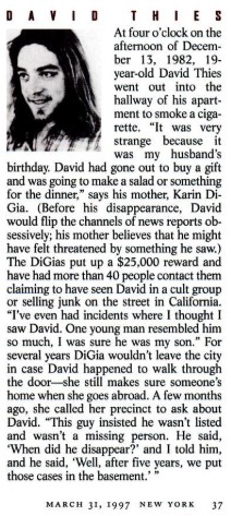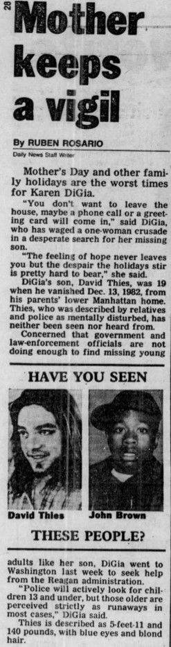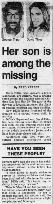 David was last seen outside of his parents’ apartment in Manhattan at approximately 4:00 p.m. on December 13, 1982. He went into the hallway to smoke a cigarette and never returned. His mother, Karin DiGia, reports that it was her husband’s, Ralph DiGia‘s, birthday and David had gone out earlier to buy him a gift and was going to making a salad or something for dinner that day.
