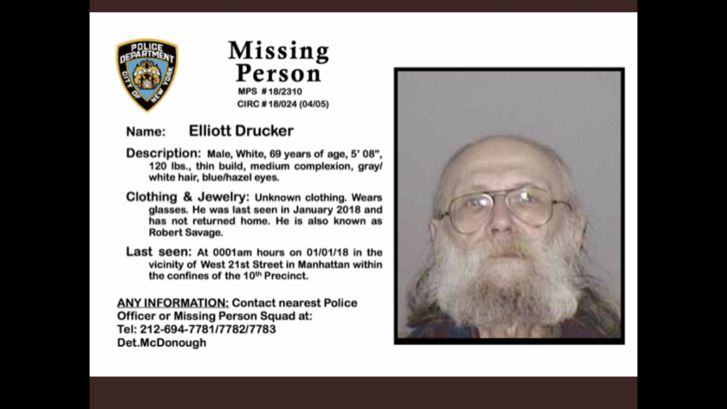 Elliott Drucker aka Robert Savage has not been seen since approximately January of 2018.