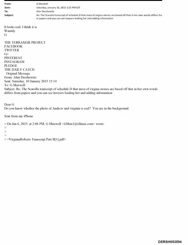 The duke's legal team had claimed it might be a fake, but an email obtained by the Daily Mail shows that even Maxwell, who appears in the background of the photo, believes it to be real.