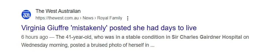I posted it above but from the article "A Sir Charles Gairdner Hospital spokeswoman told Daily Mail Australia on Tuesday night there was no patient under Ms Giuffre's name at the time, but was unable to confirm whether such a patient had previously been discharged. "