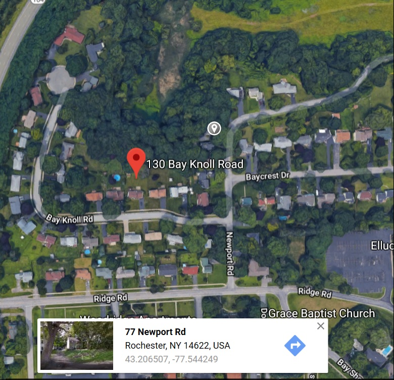 The victim's skeletal remains were located in a shallow grave behind 130 Bay Knoll Drive. She was discovered by young boy who was digging at the rear of his property. The area is adjacent to Irondequoit Bay. The yard backs up to a steep hill overlooking a valley.